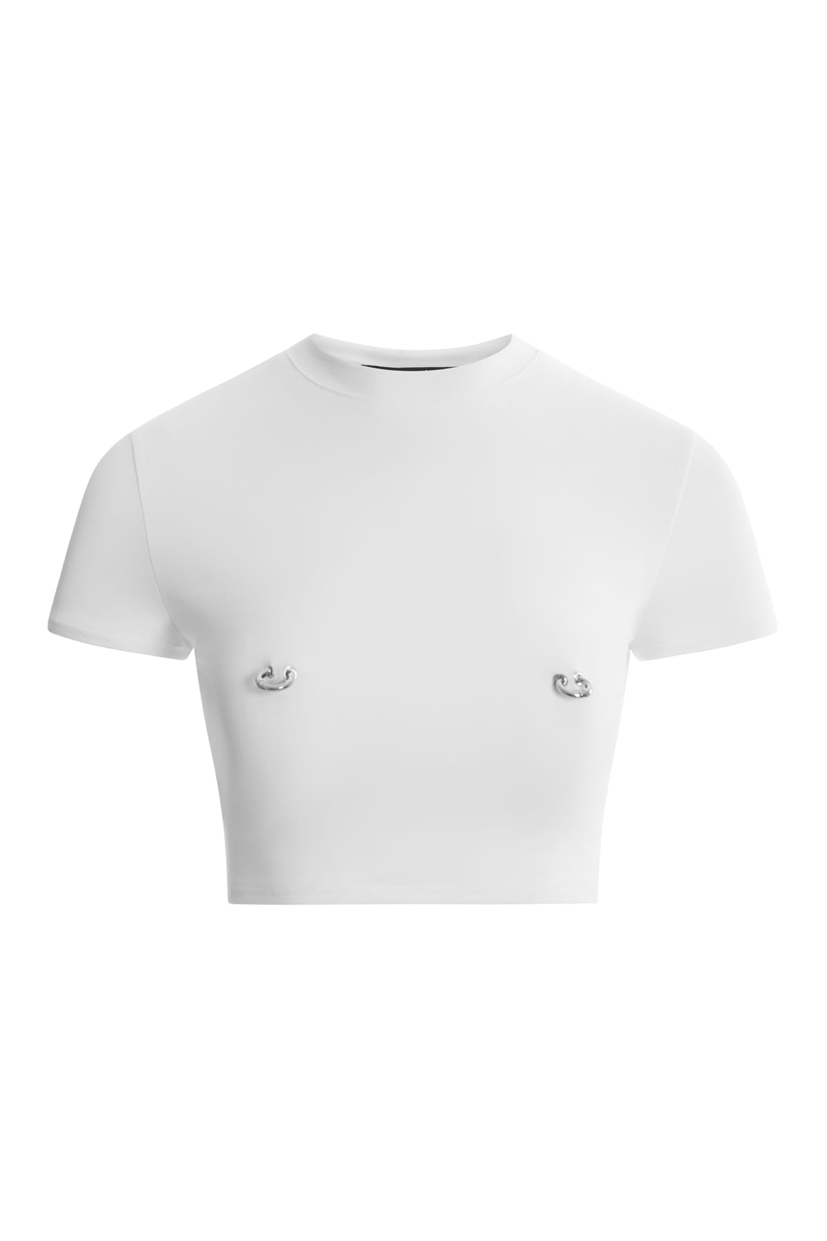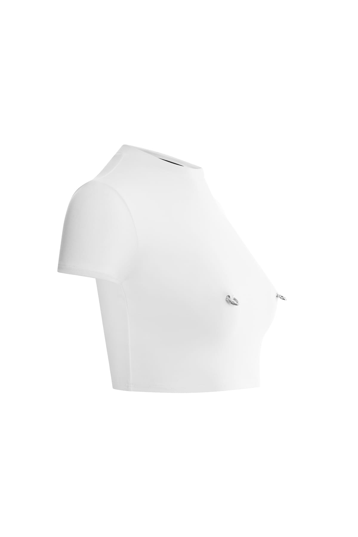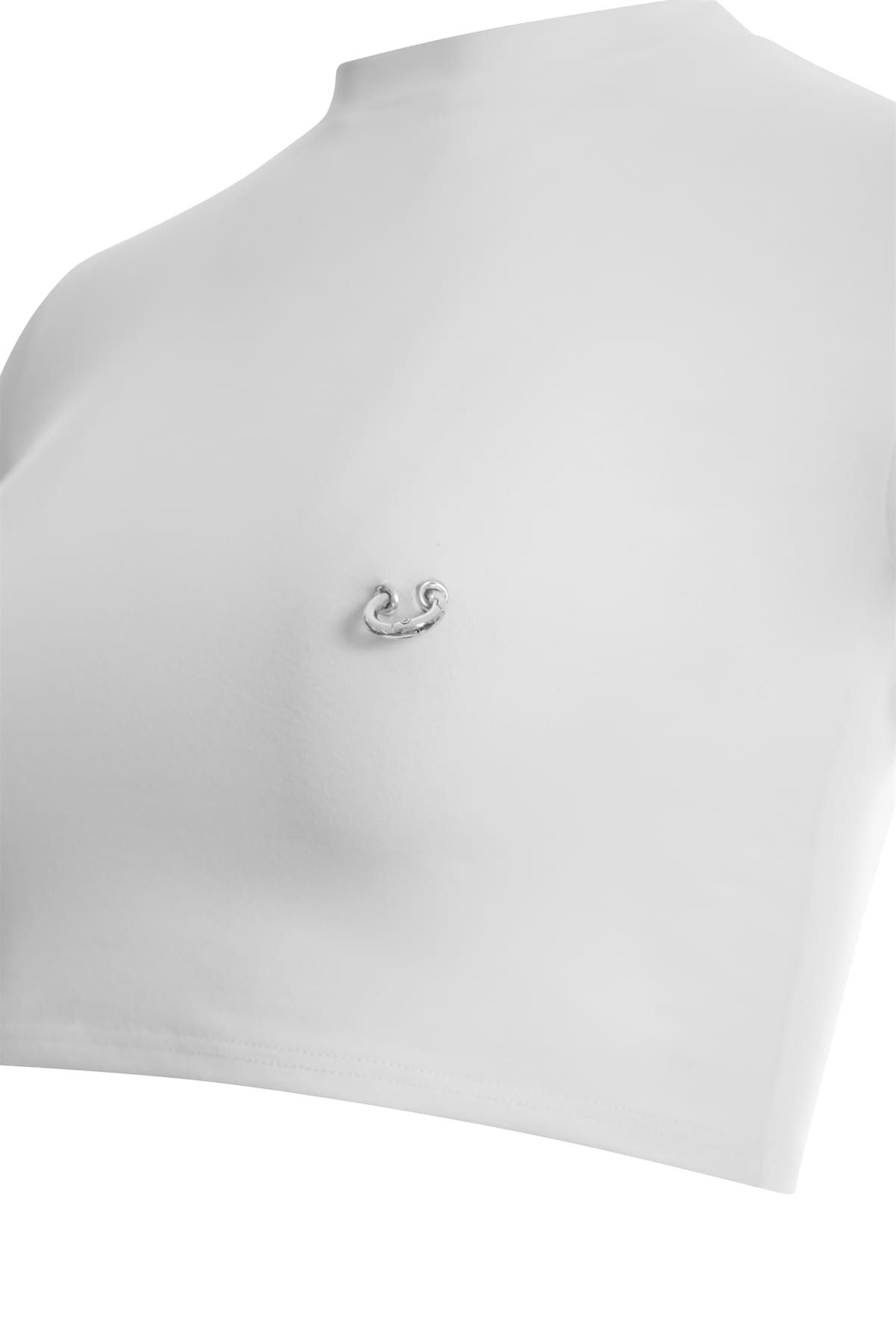 The Nymphia White Top is the perfect expression of contrast between purity and provocation. Its sleek, minimalist design is enhanced by silver-tone piercing accents, creating a powerful and sophisticated visual effect.