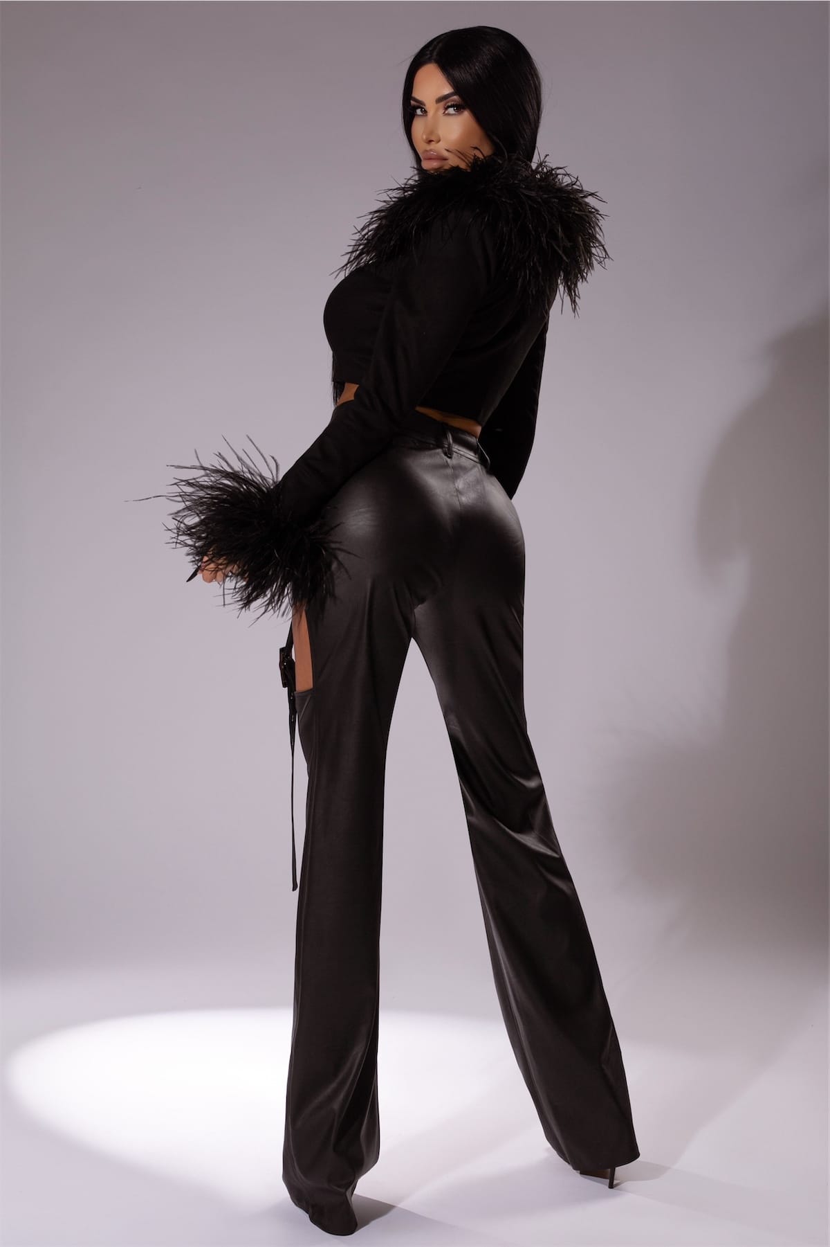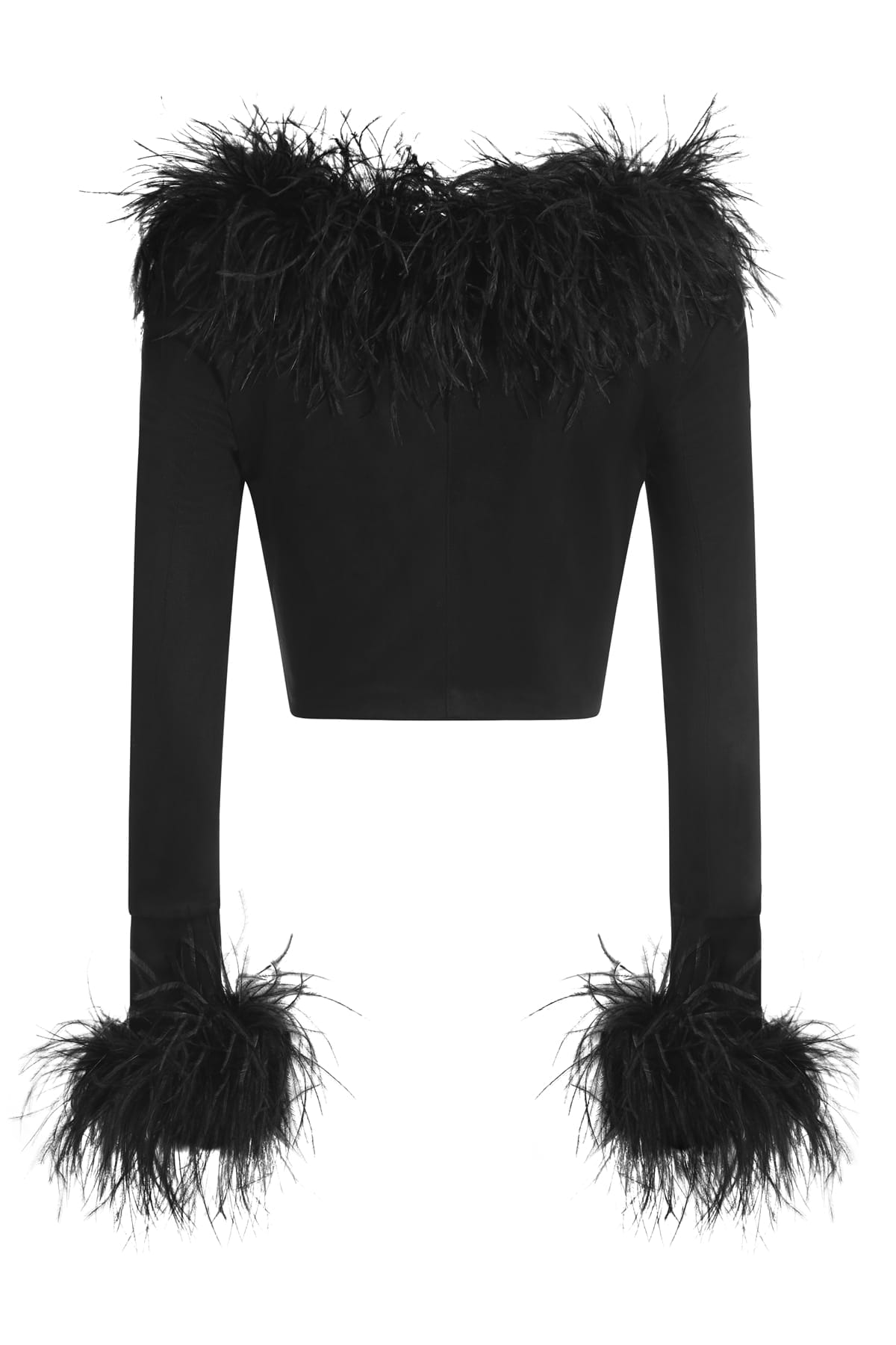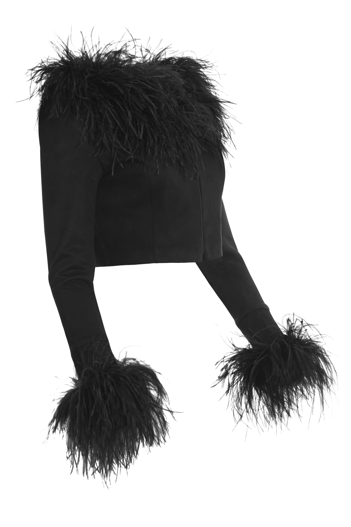 The structured fit, discreet zipper closure, and full lining ensure both style and comfort. The feather embellishments add a dramatic touch, making this jacket the perfect choice for glamorous events or high-fashion styling.