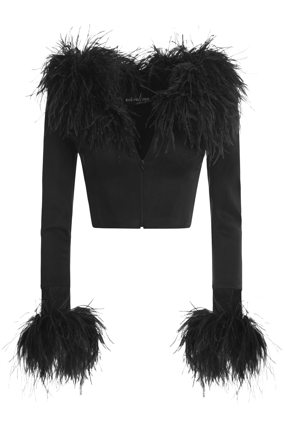 The ObsidianFeathers Jacket by ZebraLines is a refined statement piece, crafted from soft alcantara and adorned with premium ostrich feathers. With its structured fit, discreet zip closure, and full lining, it offers both comfort and couture-level impact. Perfect for glamorous events or avant-garde styling, this jacket blends luxury and drama in a truly unforgettable way.